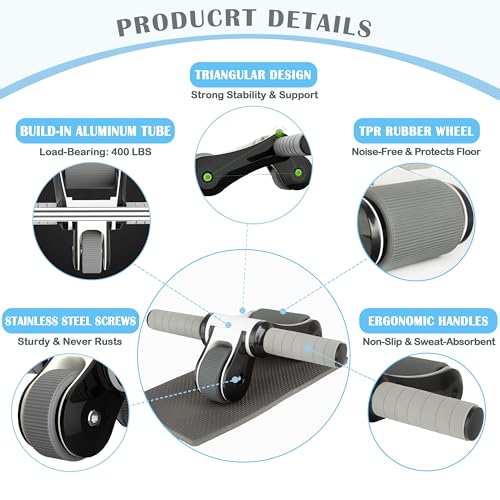 【Aluminum Alloy and Sponge Handles — 400 lbs Bearing】Thanks to the aluminum alloy ab roller wheel handles, its load-bearing capacity is up to 400lb, it is suitable for men, women, girls and students. The soft foam surface handle are ergonomic design, offering an easy , comfy and non-slip grip. All are under your control when doing workout exercise.